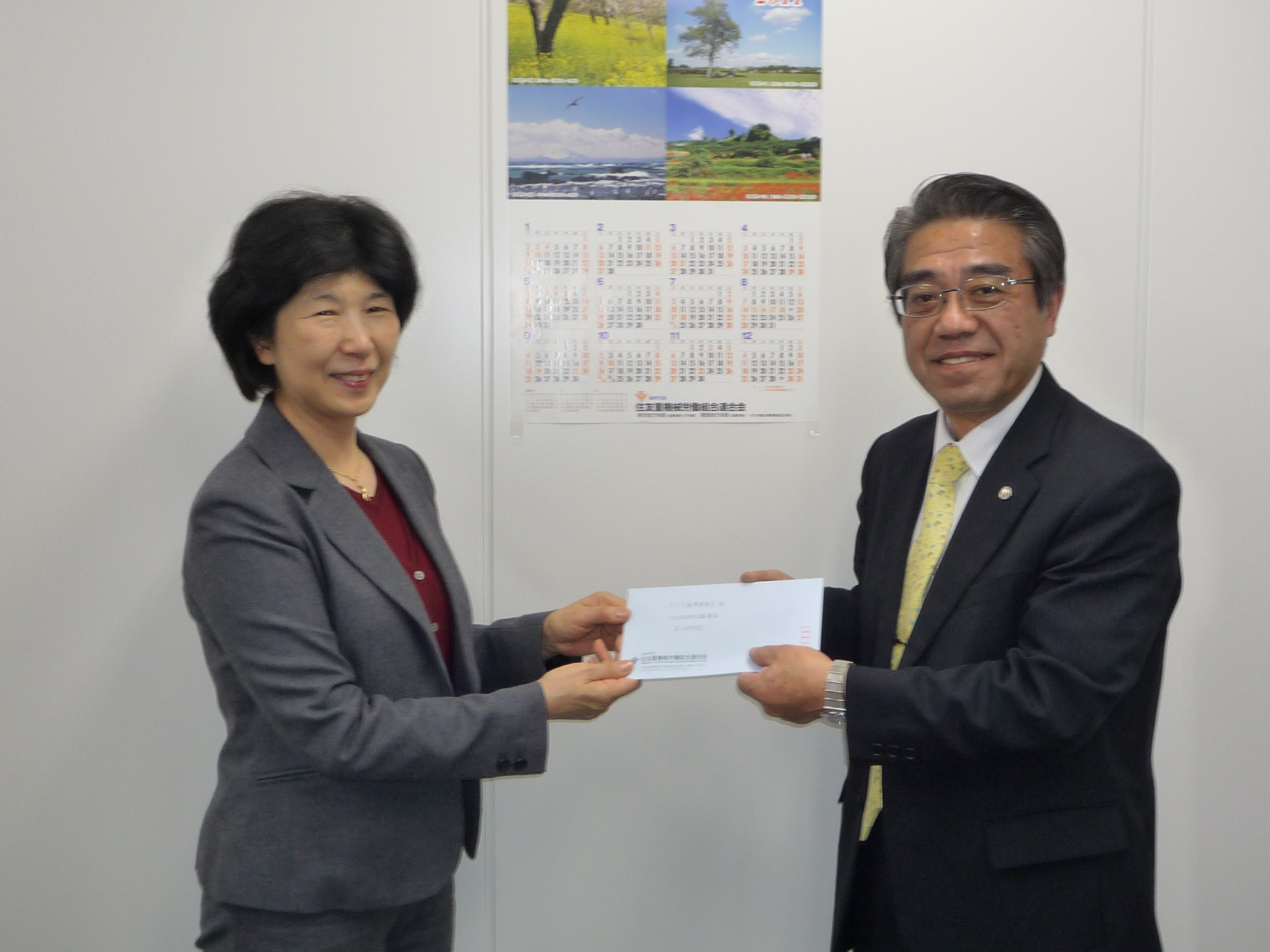 1月27日、住友重機械労働組合連合会本部において、越野委員長より、高校生支援募金のために10万円が渡邉CSA事務局長に手渡されました。