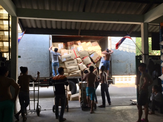 タイ向け衣類5,282箱(40f.コンテナ7本)は、10月16日に東京港から船でタイに輸送され、10月31日にタイのラムチャバン港に到着しました。到着港が従来と変更になったため、荷揚げ手続きに時間がかかり、タイ社会開発福祉省の衣類保管倉庫には11月30日に届けられました。