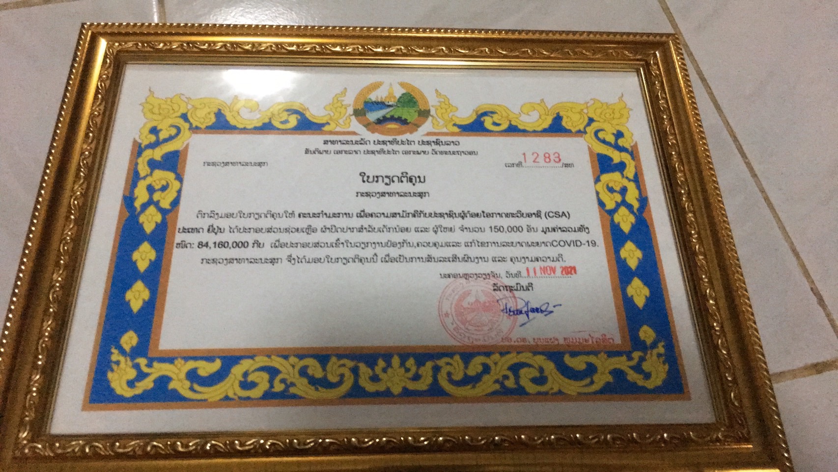 ラオス・タイ両政府からの感謝状の骨子は『CSAの支援に担当省を代表して衷心より感謝を申し上げます。この度の不織布マスクは、新型コロナウイルスのパンデミック等により国内の困窮する人々に配布してまいります。CSAの継続的な慈悲深い支援は高く評価され、そして感謝されています。私たちはCSAに関係する全ての皆様の健康と幸福そして繁栄を願っています。今後ともよろしくお願いいたします』