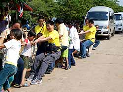 訪問先では、地元関係者から活動状況の説明を受けるとともに、学用品を寄贈し、綱引き、ボール運び競争、折り紙の指導などを行い子供らとの交流を図りました.