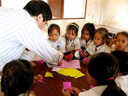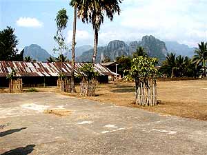 ムァンソン村小学校は、ビエンチャンから約3時間、150kmほど北上した国道13号線沿いの村です。周辺には、桂林を思わせる山並みと、渓流下りができる川があります。このため外国人観光客も多いところです。また、戦争当時、米軍が使用した飛行場の跡があります。この飛行場跡は外国資本により整備され使用される計画があるそうです。村の人口は1300人ほどですが、飛行場が整備されれば人口は大幅に増えることが予想されます。
