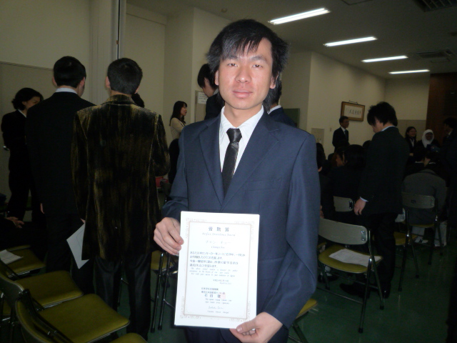 2012年3月16日(金)、日本学生支援機構・東京日本語教育センターにおいて、昨年4月に来日し、現在、日本語習得中のラオス留学生(サンティパープ高校寮5期生)、チュー・チャン君とシン・リー君の2名が日本語研修を終え、無事に卒業証書を手にした。なお、チューチャン君は皆勤賞も授与した。