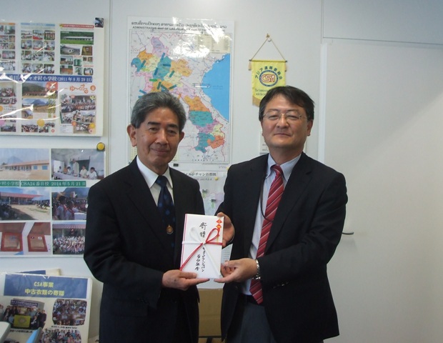 この日は、武井委員長が来局し、吉井会長に「ラオスの学校建設・補修募金として、組合員の善意を寄付致します」と、金10万円を手渡しました。 そして、「昨年支援団体になり、CSAの活動を知って、ラオスの小学生のために支援したいと思いました」と述べました。