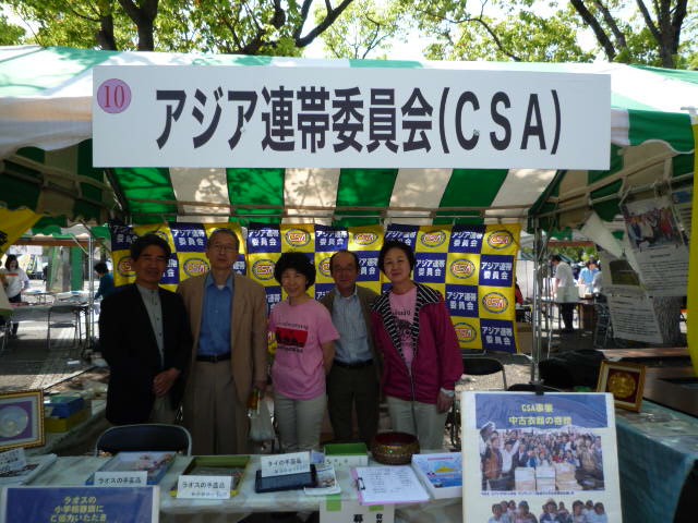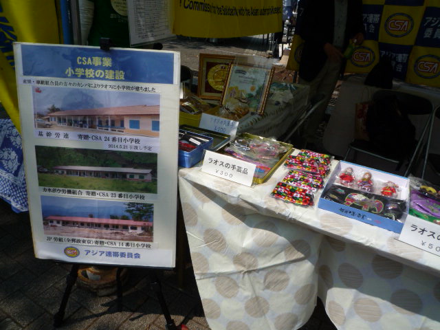 神津連合事務局長や連合スタッフと共に 小学校を紹介したパネル 今年もラオスやタイの物品を販売