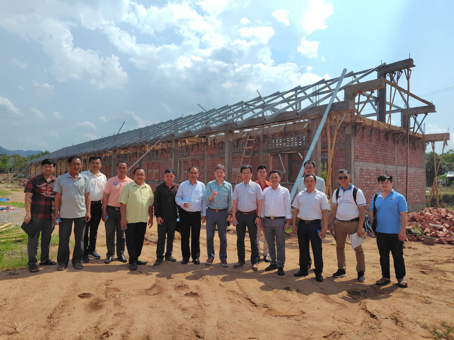 建設中校舎前で関係者一同 ナラオ村小校長先生たちと 蘇ったパホム村小校舎