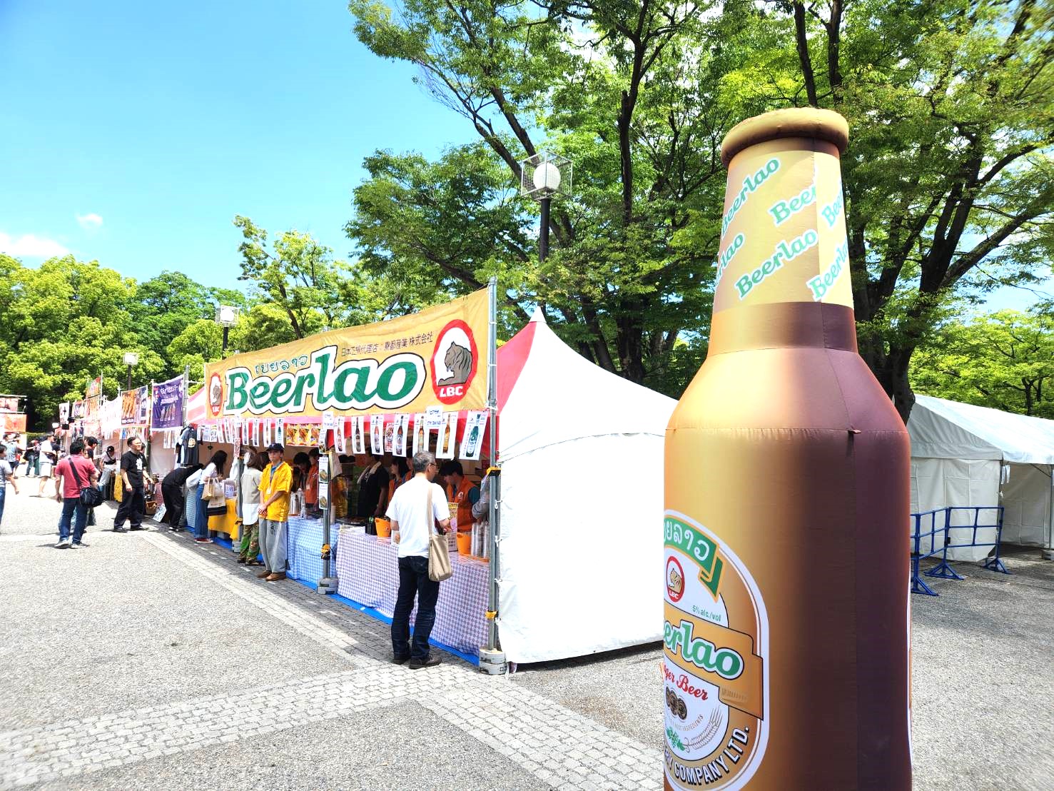 その後、会場内を散策すると、民芸品や食品販売の他、伝統舞踊・バーシー儀式の体験、ラオス語講座など60に及ぶブースが並び、ラオス本国からの出店もありました。『日帰りで行けるラオス』のキャッチコピーの通り、日本でラオスの魅力を知ることができます。私の一番のお目当ては、酷暑のラオスで活動する際に喉を潤してくれる「ビアラオ」です。現地価格の約4倍ではありましたが、美味しくいただきました。