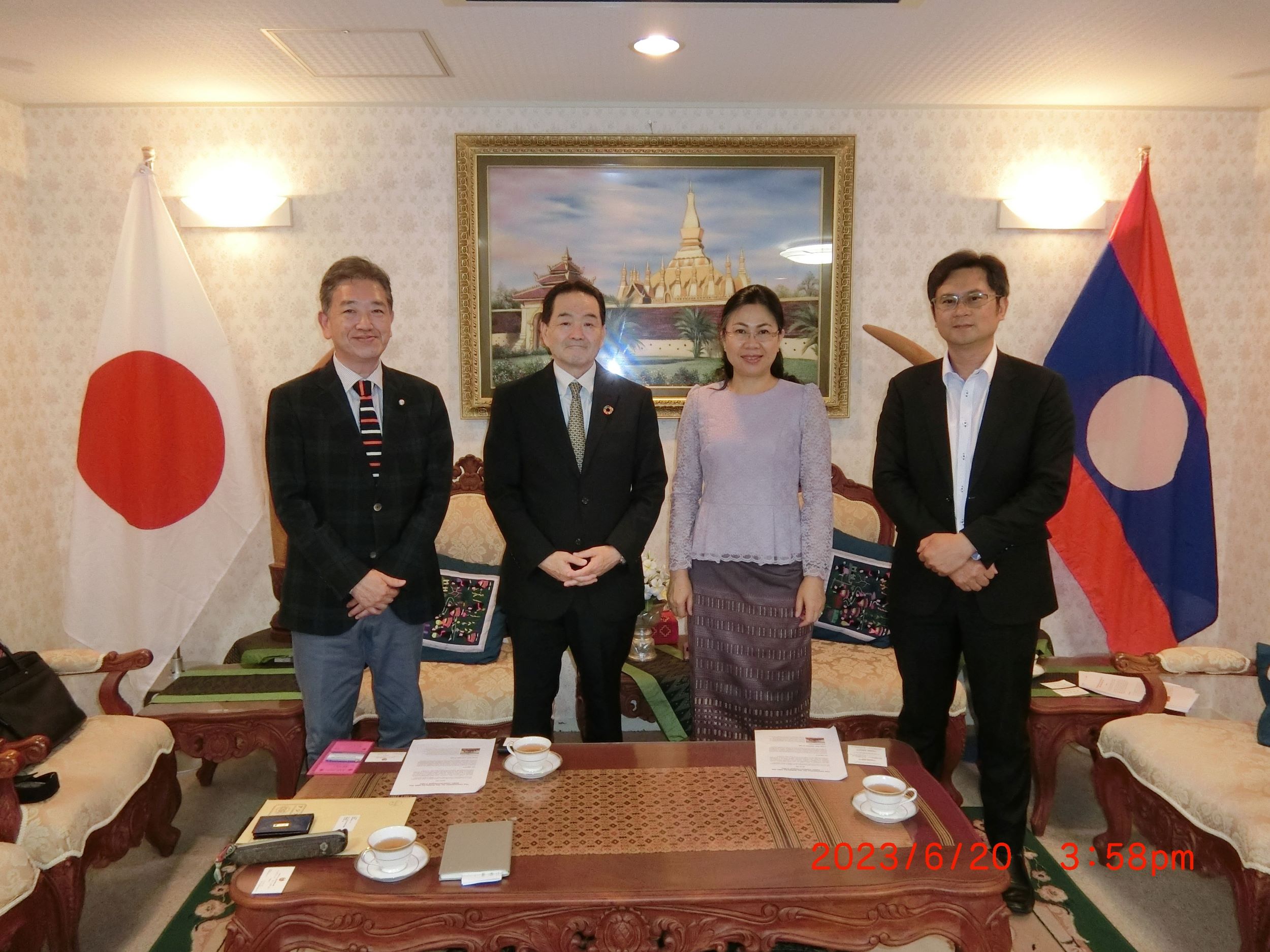 6月20日、鈴木副会長と山﨑事務局長で、港区西麻布にある駐日ラオス人民民主共和国大使館を訪れ、5月に実施したラオス視察についての報告をしました。報告の内容は、①ナラオ村に建設・寄贈した小学校新校舎の引き渡し式を無事に終えたこと、②26番目の小学校建設に向けて現地と連携して進めていることの2点です。