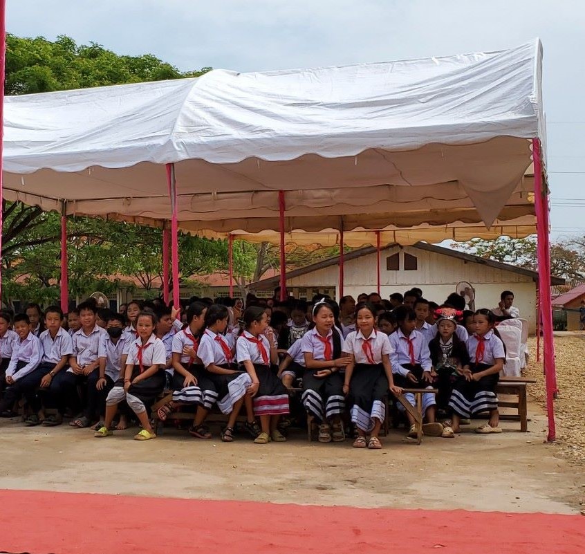 ラオス教育・スポーツ省訪問 フォンサムット大使と書記官 ナラオ村小の生徒たち