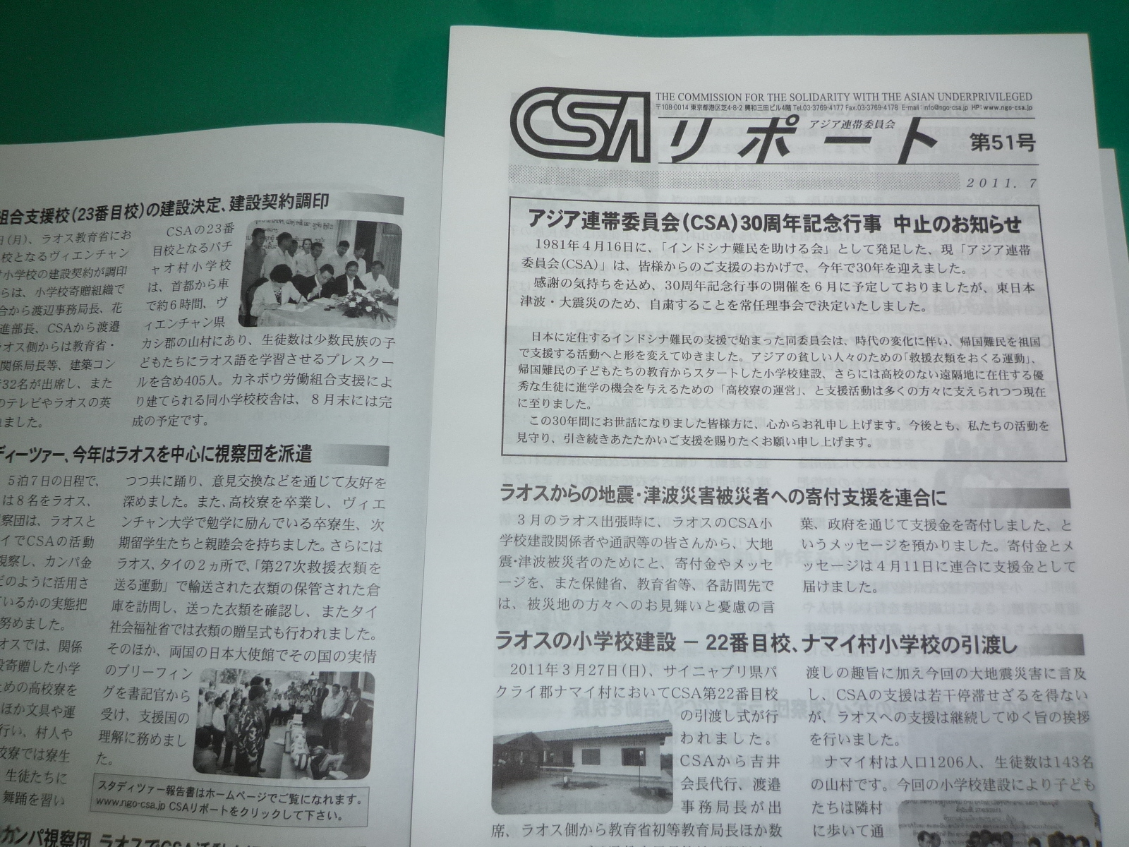 2011年8月27日(土)、ヴィエンチャン県カシ郡パチャオ村にCSA第23番目校がカネボウ労働組合から寄贈され、引渡し式が行われた。カネボウ労働組合から瀬村委員長はじめ計7名が、CSAから吉井会長代行、渡邉事務局長が出席、ラオス側から教育省初等教育局次長ほか数名、ヴィエンチャン県教育局長、カシ郡長、パチャオ村長、小学校校校長等関係者に加え100名以上の村民が参加した。
