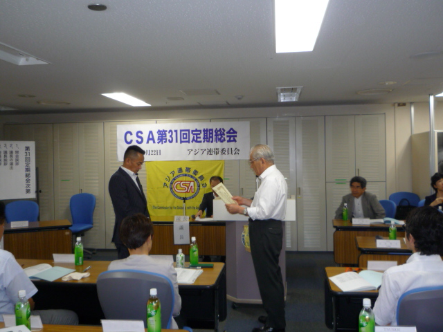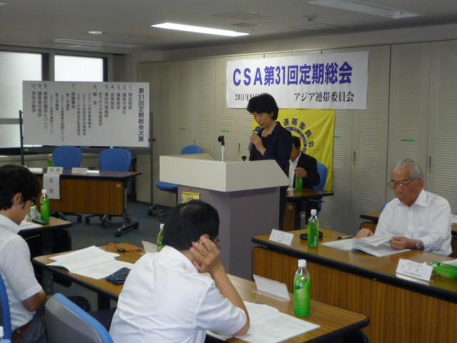 アジア連帯委員会(CSA)は第31回定期総会を2011年9月22日(木)、14時から東京・連合本部3階で開催し、2010年度活動報告、決算報告などが報告・承認された。今年度事業は(1)救援衣料を送る運動 (2)ラオス・小学校建設 (3)遠隔地校生支援(サンティパープ高校・寮生支援)を柱とした2011年度事業計画方針、2011年度予算案などが報告、審議され、満場一致で承認された。
