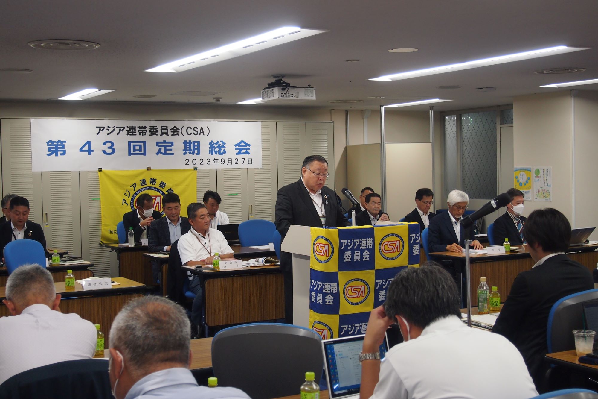 9月27日、連合本部においてアジア連帯委員会(CSA)第43回定期総会を開催しました。コロナ感染症が5類に引き下げられたこともあり、例年になく沢山の評議員にご参集いただき華やかな総会となりました。冒頭、澤田会長は、団体・個人会員の皆様の物心両面のお支えにより事業が継続できていることへの感謝と、三本の柱である主要事業について触れられました。ご来賓には連合本部 清水事務局長、国際労働財団 小川副事務長より激励のご挨拶を受けました。また、CSA元副会長の渡邉様にも傍聴としてご臨席いただきました。