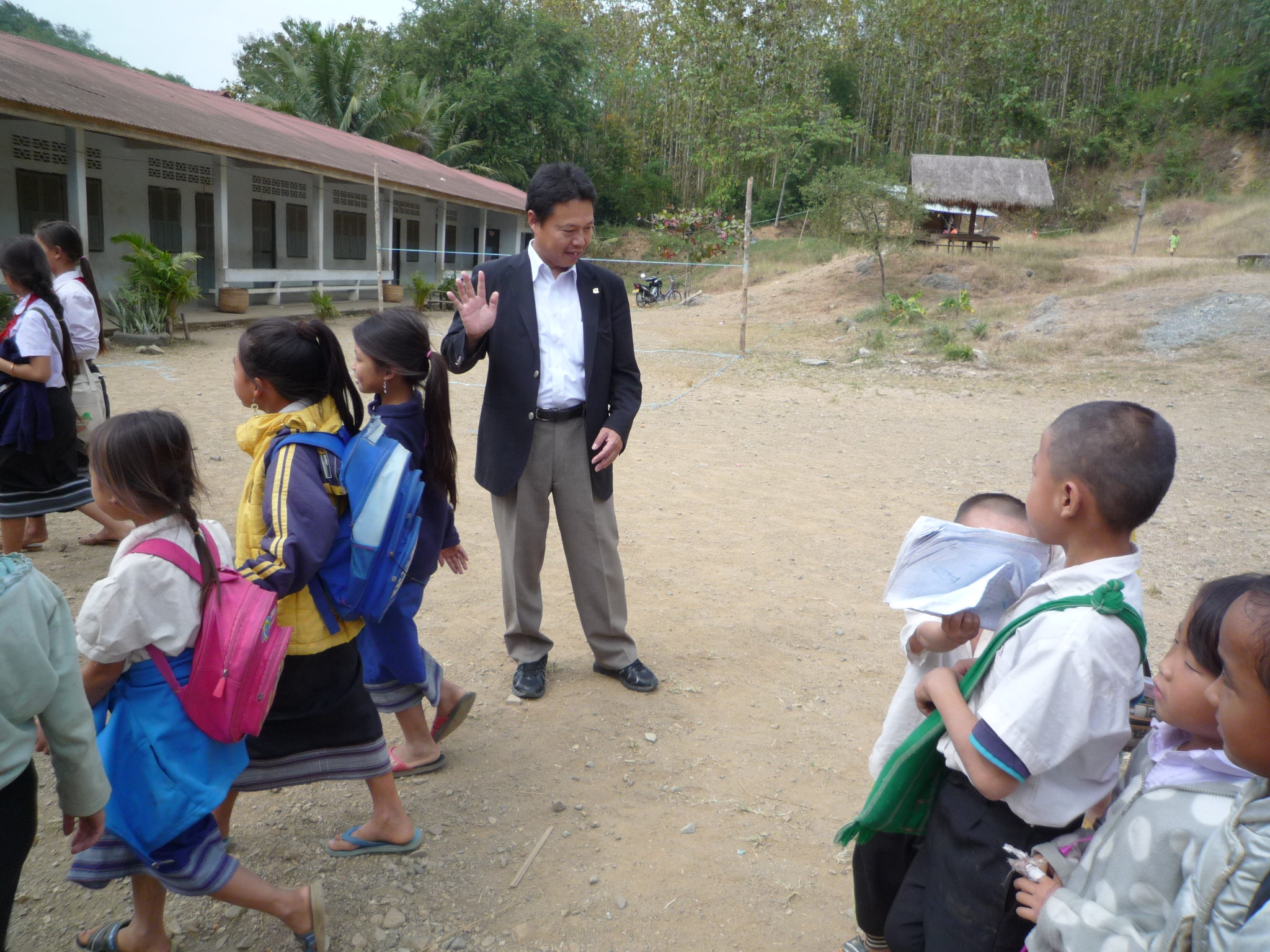 視察団は、ラアンプラバンにあるコァティヌン村小学校(13番目校)とサンティパープ高校寮を視察し、コァティヌン村小学校では、生徒たちから歓迎を受けた後、校長、村長ほか関係者から説明を受け、生徒の男女比率、中学への進学率等の質問をするなど、活発に意見を交わしました。その後、ボールなどのお土産にはしゃぐ生徒たちとともに校舎を見学しました。
