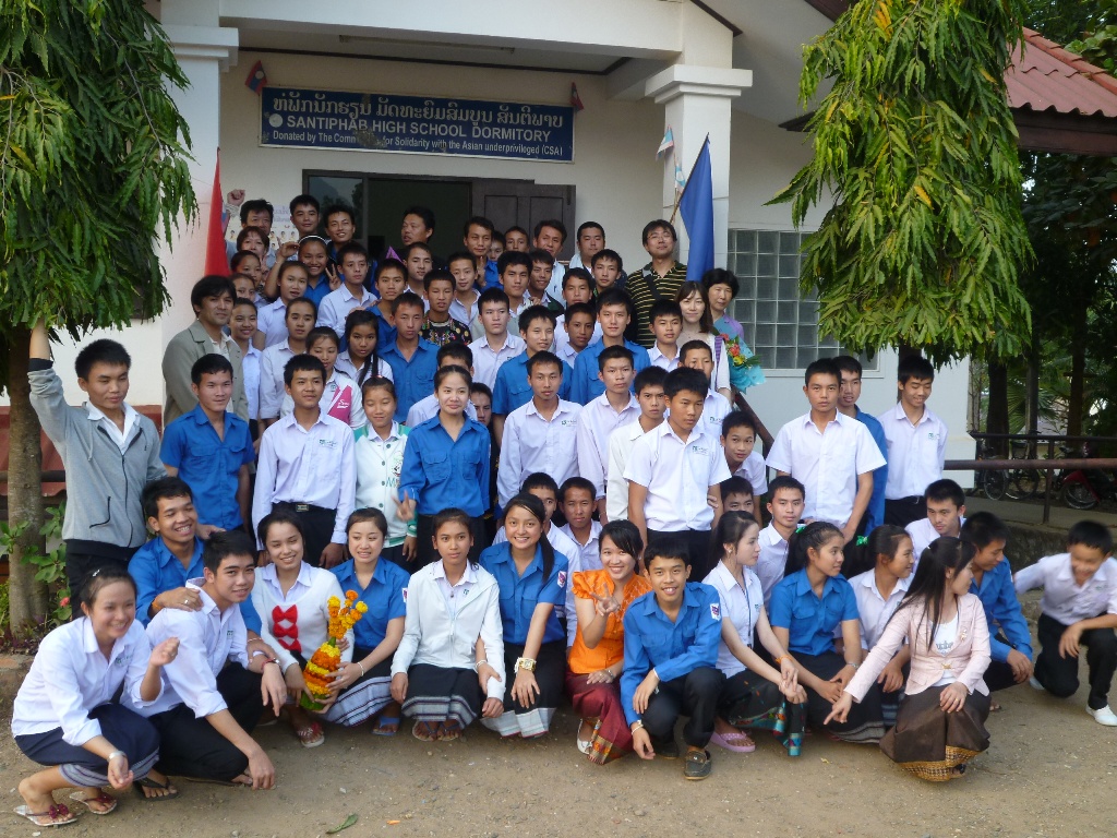 サンティパープ高校寮では、歓迎のセレモニーであるバーシーが小学校同様に行われたのち、寮生たちからラオス舞踊、歌などの歓迎を受けました。教師のほか生徒とも活発な意見交換を行い、生活面、学力向上などに関する数々の要請に耳を真摯に傾け、返答をし、課題を持ち帰り検討することが約束されました。