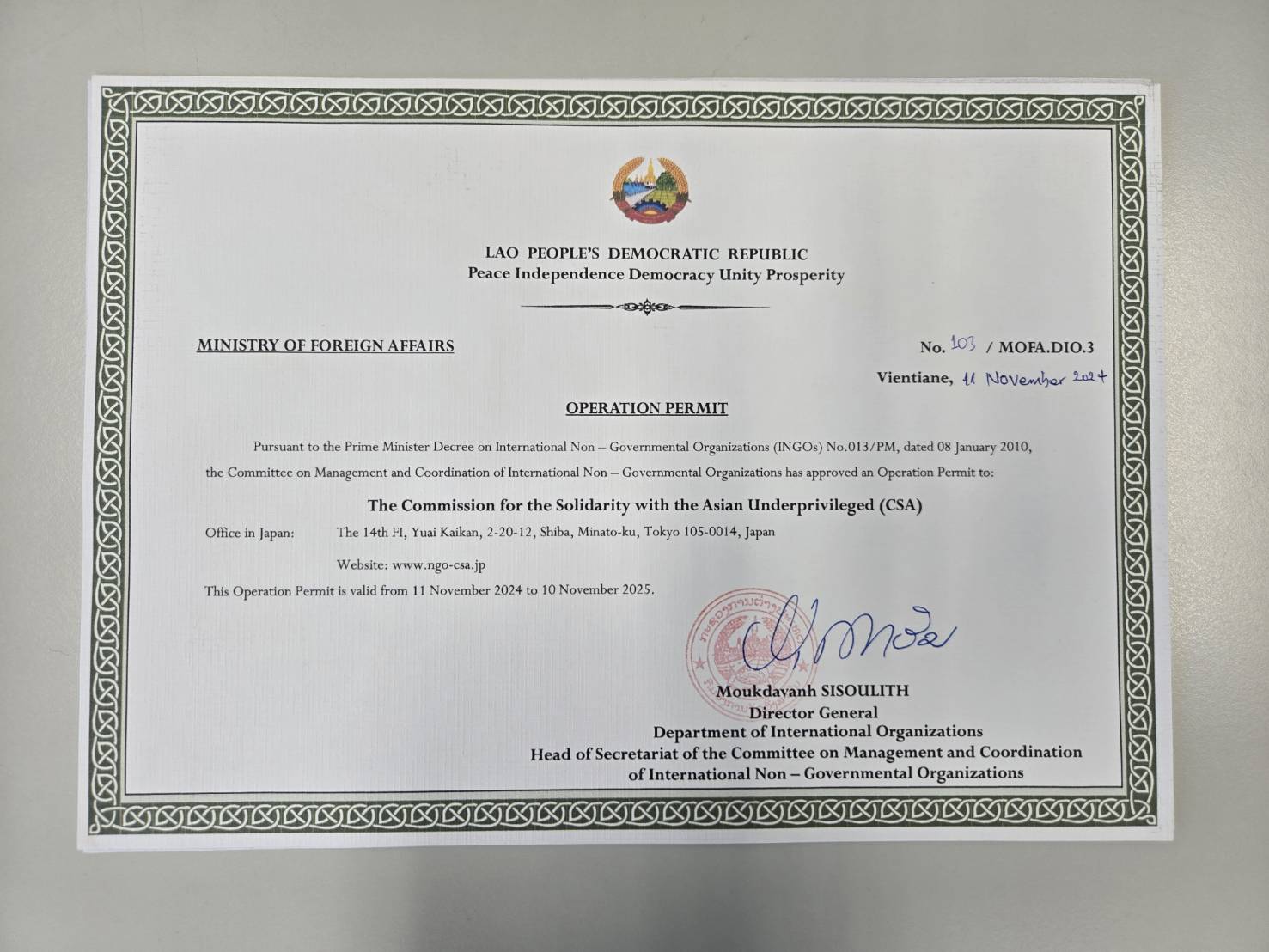 また、懸案事項でありましたラオスにおける事業運営許可書(OP)を先月取得することが出来ましたので、発行に当たってお手伝いいただいた連合杉山連帯活動局長(CSA常任理事)へのお礼を兼ねて、この許可書の効果と今後の取り扱いについて共有をしました。